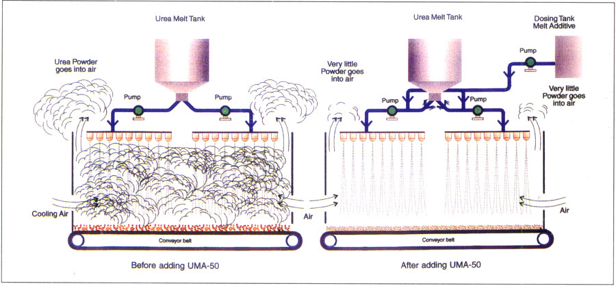 Urea prills without additives easily become powder even on little pressure or rubbing. With the use of UMA-50, they become tough and resistance to breaking into powder at pressures encountered in loading, transit, storage at the factory and distribution centres.